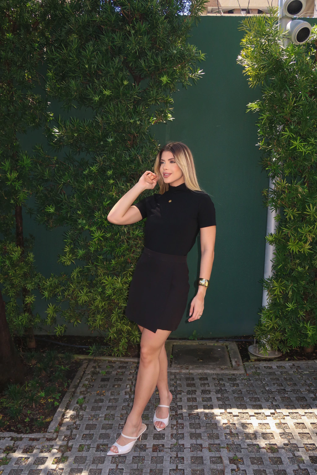 A Saia Minimalista é a escolha ideal para compor looks sofisticados e contemporâneos. Com trespasse de detalhe na parte frontal, ela proporciona um charme sutil e moderno.