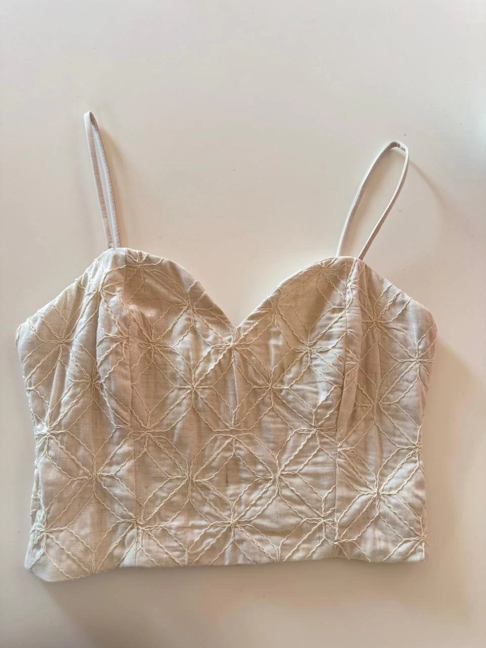 O Top Jade é uma peça delicada e sofisticada, confeccionada em tecido texturizado com desenho geométrico em relevo, que traz um acabamento diferenciado e elegante. O modelo possui decote coração, valorizando o busto, e alças finas reguláveis, que garantem melhor ajuste ao corpo.