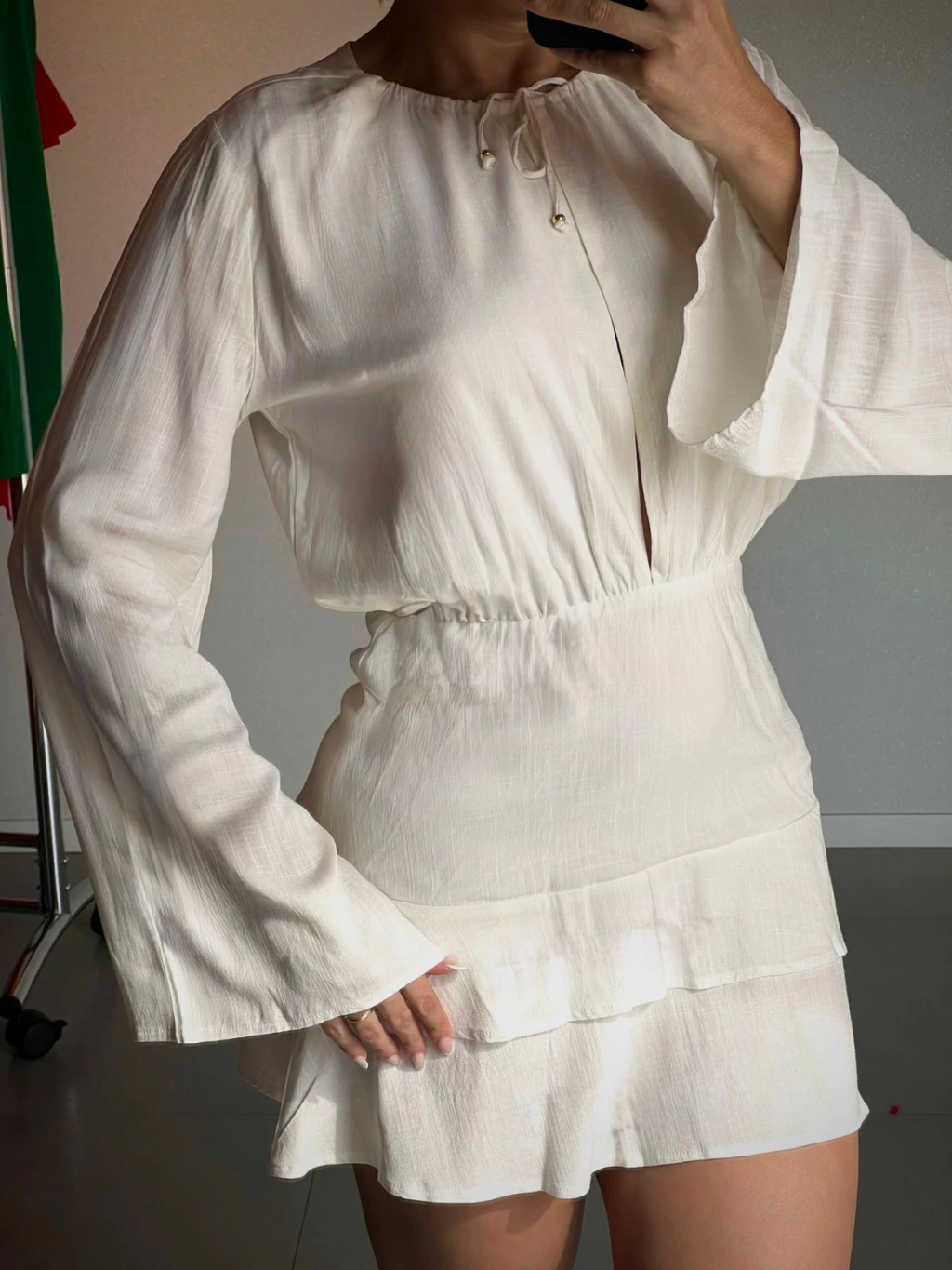 O Vestido Thassia combina leveza e sofisticação em uma silhueta moderna. Possui mangas amplas estilo flare, decote com amarração e cintura marcada, valorizando a forma com conforto. A saia em camadas traz movimento e um caimento impecável, perfeito para produções elegantes e atuais.